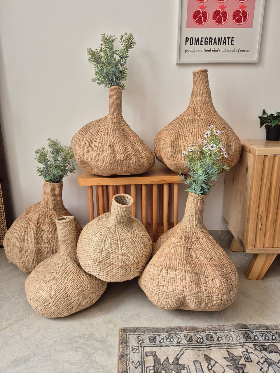 Our Long-neck garlic basket, a bold, sculptural statement piece inspired by the organic form of garlic, handwoven from natural fibers. The long neck design adds height and elegance, making it perfect as a floor vase or decorative accent. Ideal for styling with dried or faux stems, it brings warmth, texture, and a unique artisanal touch to any space.
