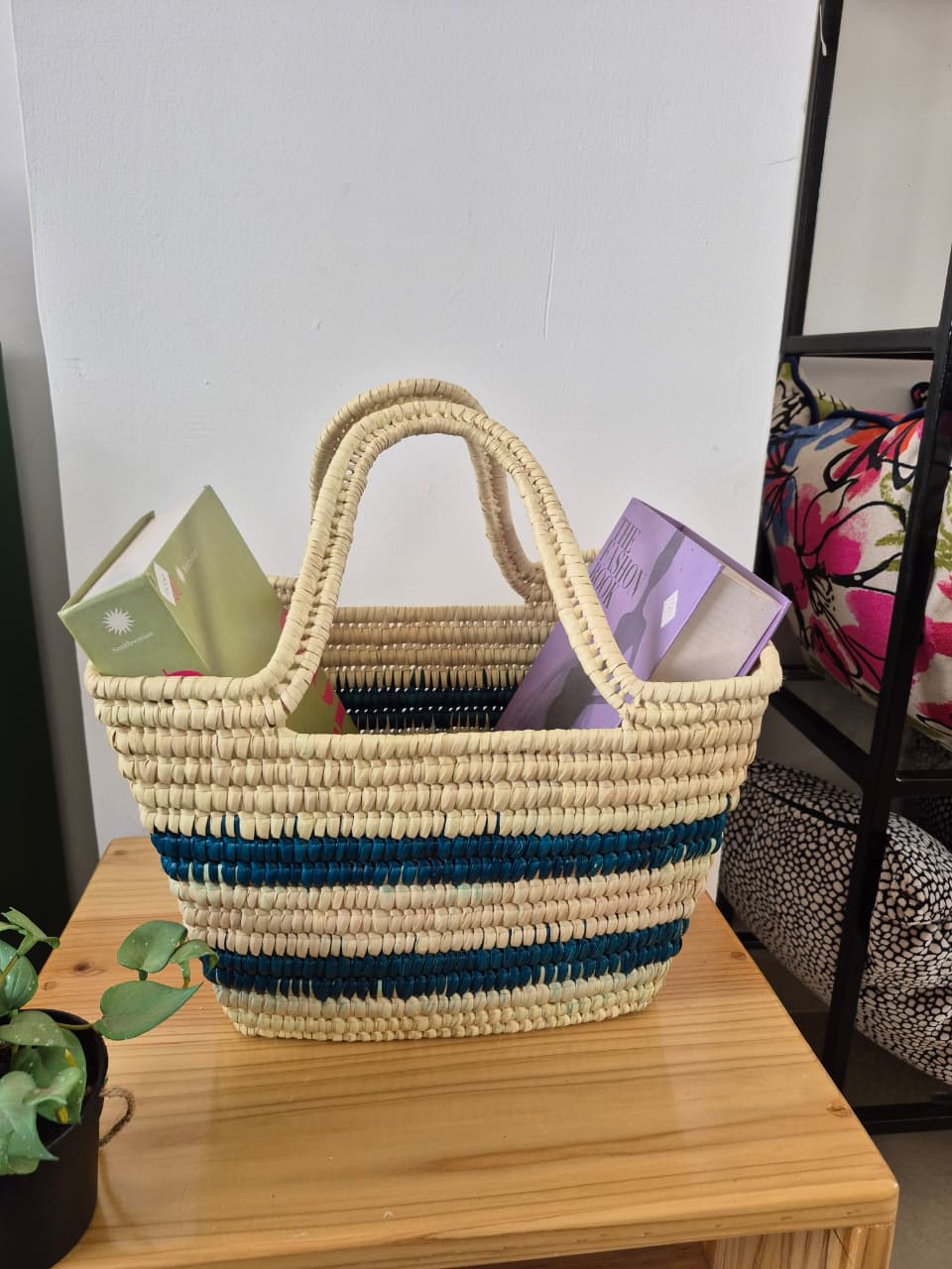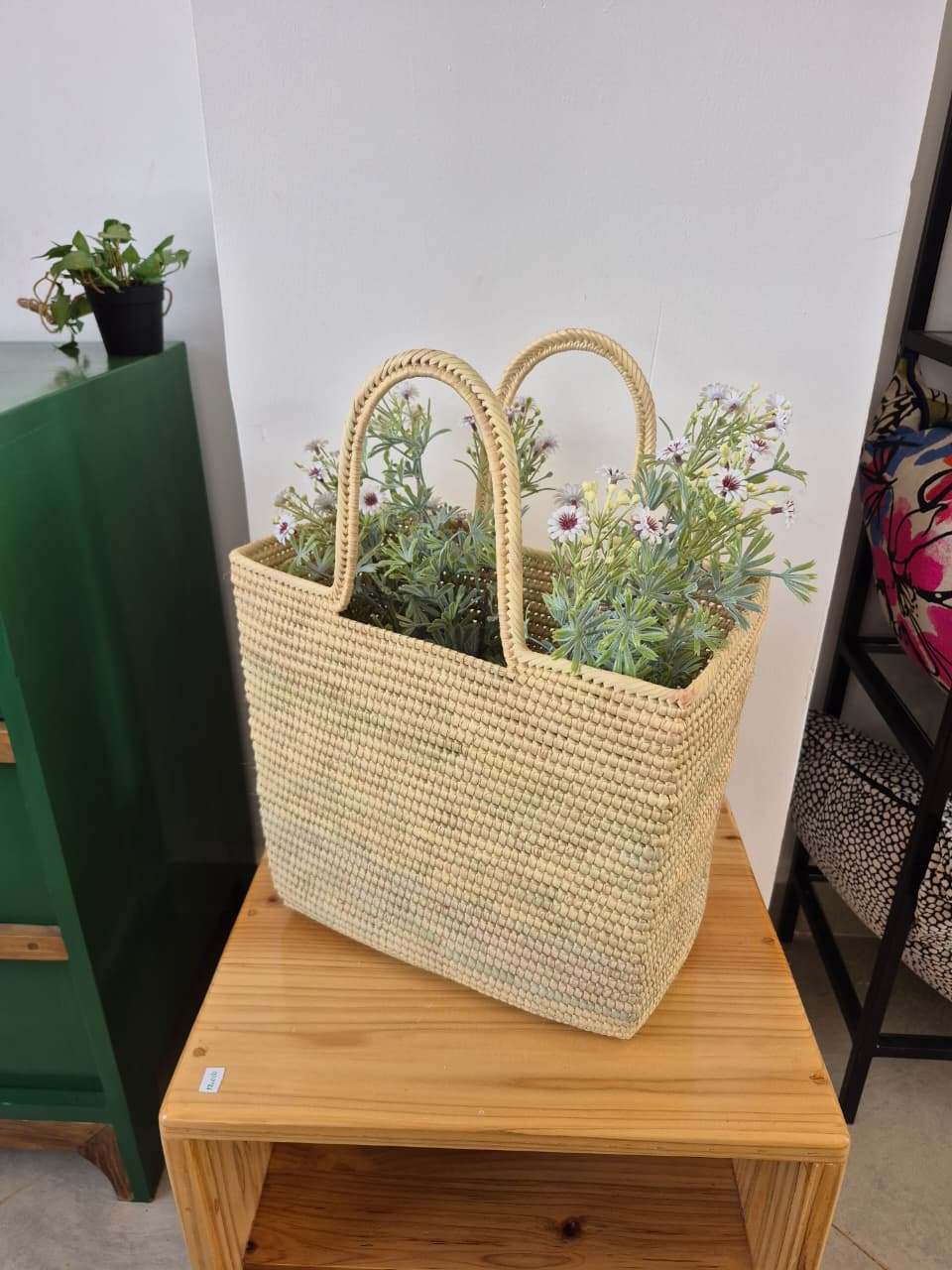 It’s spacious enough for shopping, storage, or even as a decorative piece in the home. Each bag is handmade, so slight variations make every piece unique. Plain versions are also available for a more minimal look.