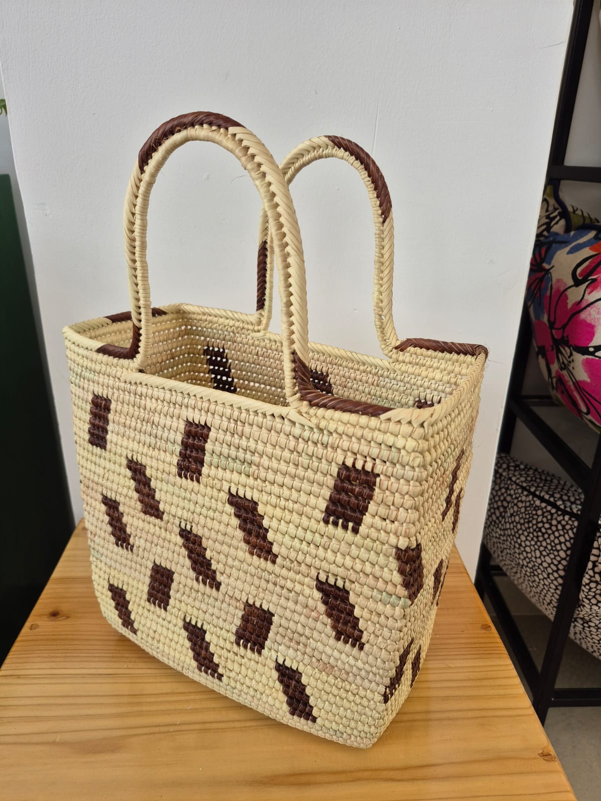 This Kadesa bag is handwoven and made to last. It has a firm, structured shape with strong double handles, making it easy to carry for everyday use. The design features a neutral base with geometric patterns, giving it a simple but distinctive look.