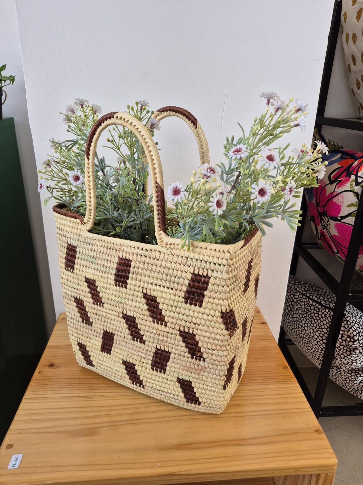Handwoven Kadesa bag with a patterned design, sturdy handles, and a structured shape. Also available in plain options.