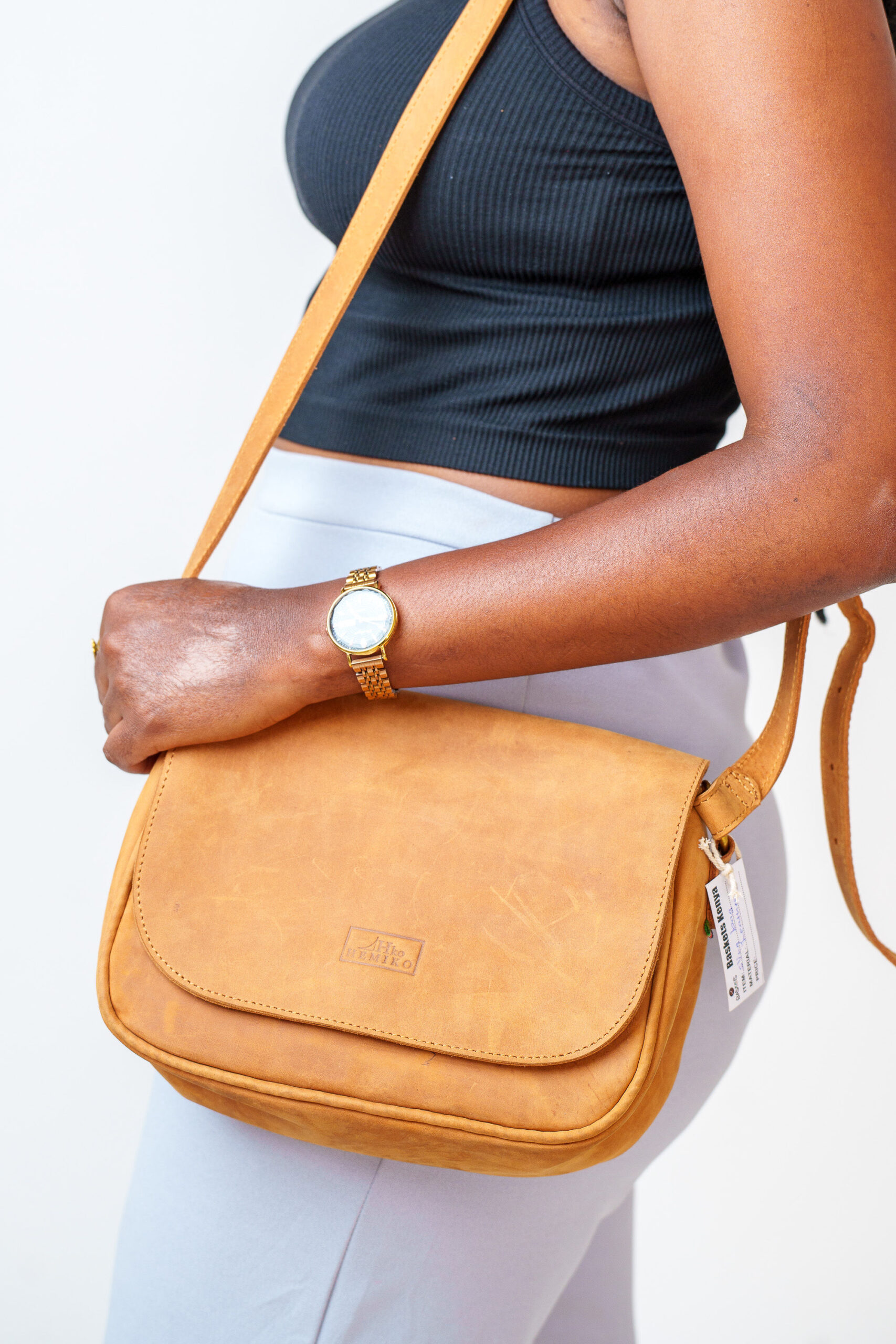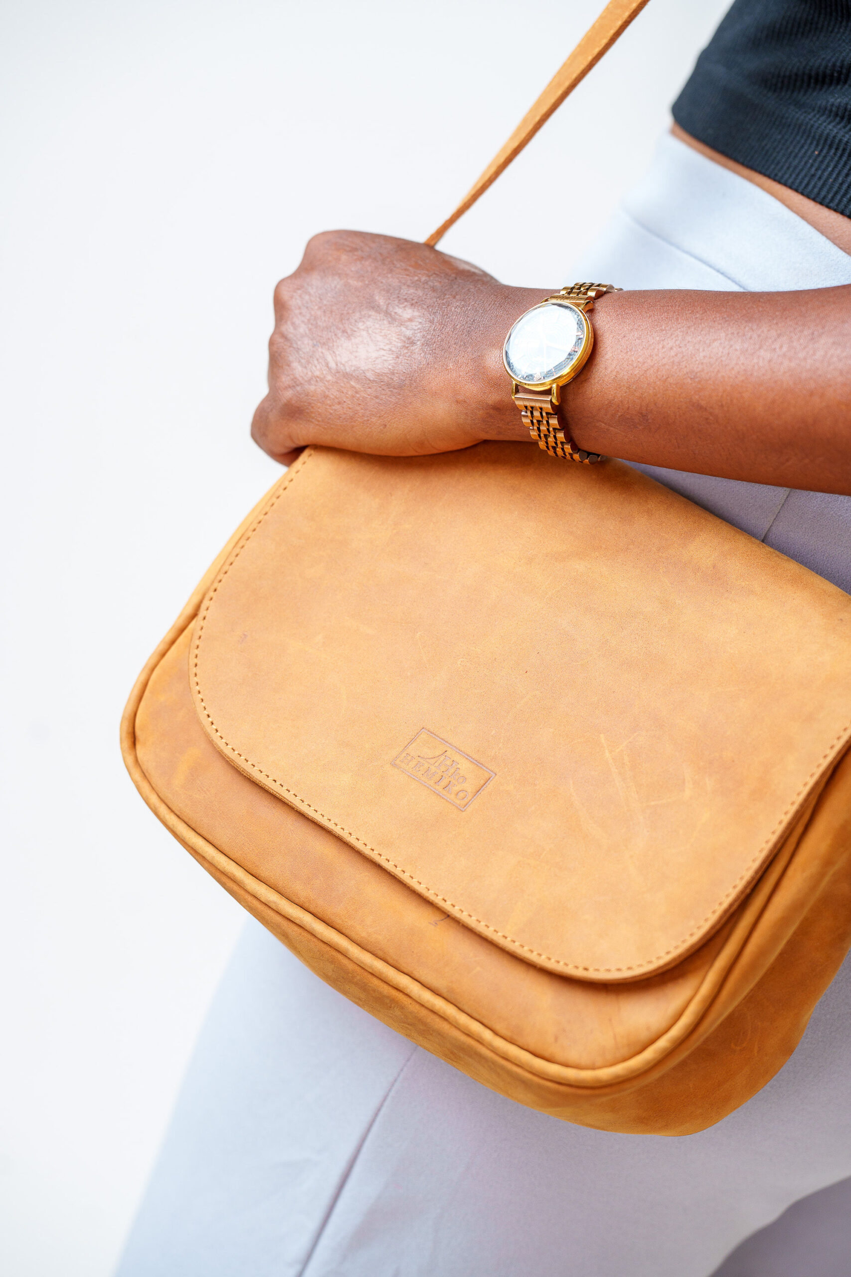 Made from soft, matte leather in a warm honey-gold tone, this rounded saddle bag is designed for easy, everyday use. The lived-in texture of the leather gives it a rugged yet clean look that only gets better with age. It features a deep main compartment with a wide fold-over flap to keep your belongings secure. The adjustable matching strap allows you to wear it comfortably as a crossbody or a shoulder bag, making it a reliable choice for travel, work, or weekend trips.
